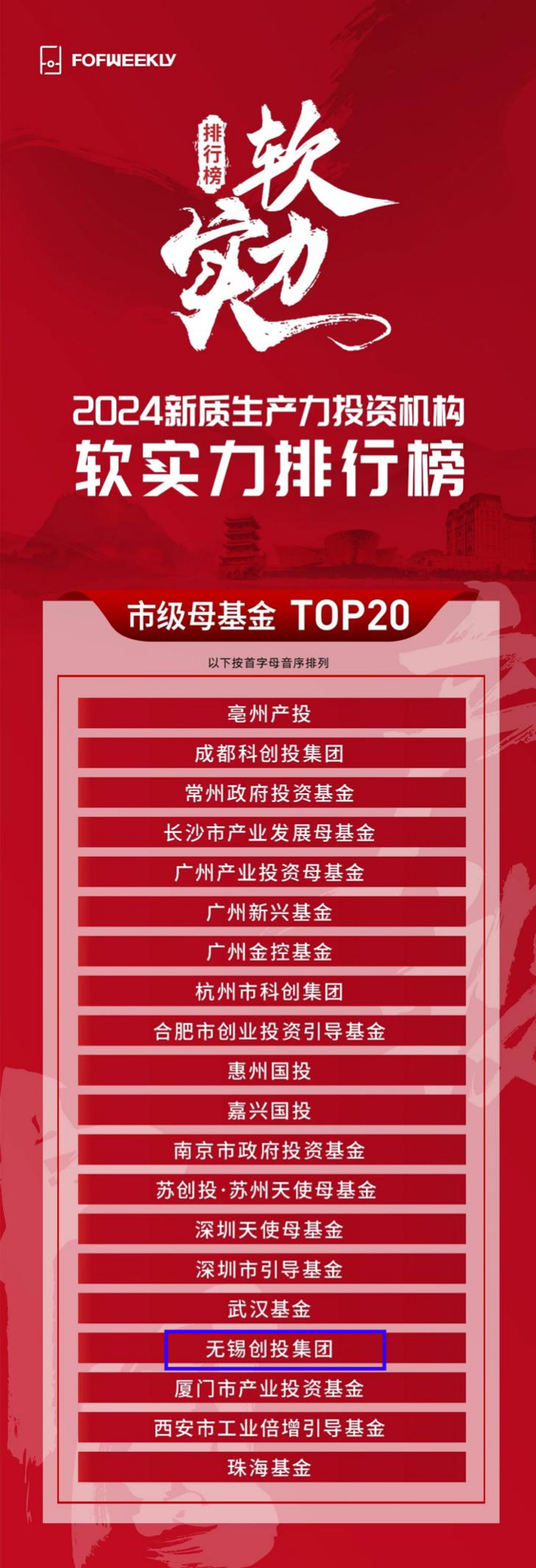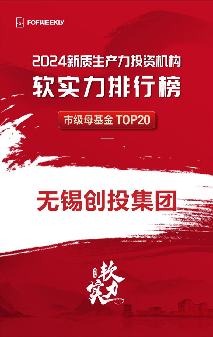 近日,《母基金周刊》(FOFWEEKLY)公布其年度排名“2024新質(zhì)生產(chǎn)力投資機(jī)構(gòu)軟實(shí)力排行榜”,無(wú)錫創(chuàng)投集團(tuán)榮登“2024新質(zhì)生產(chǎn)力投資機(jī)構(gòu)軟實(shí)力排行榜—市級(jí)母基金 TOP20”。